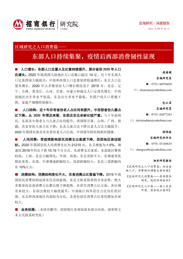 【招商银行】【20210914】区域研究之人口消费篇:东部人口持续集聚,疫情后西部消费韧性显现-19页
