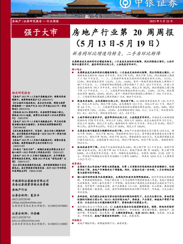 【中银证券】【20230522】房地产行业第20周周报:新房同环比增速均转负,二手房环比转降-29页