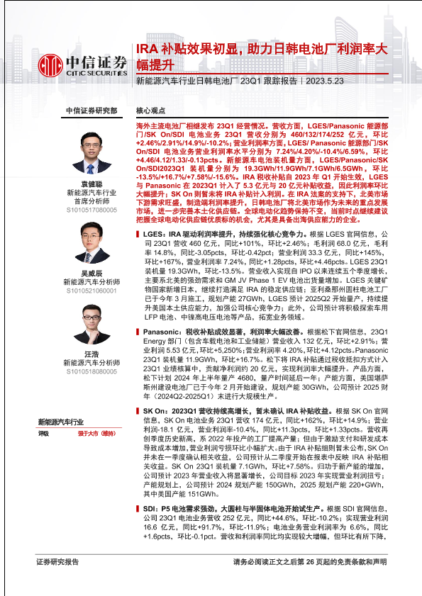 【中信证券】【20230523】新能源汽车行业日韩电池厂23Q1跟踪报告:IRA补贴效果初显,助力日韩电池厂利润率大幅提升-27页