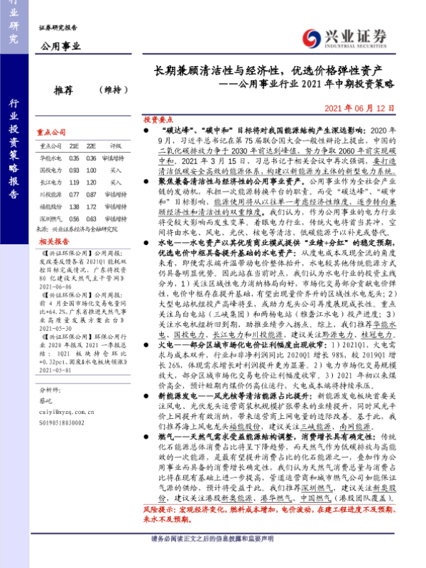 【兴业证券】【20210612】长期兼顾清洁性与经济性,优选价格弹性资产——公用事业行业2021年中期投资策略-33页