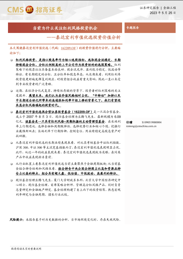 【海通证券】【20230525】泰达宏利市值优选投资价值分析:当前为什么关注红利风格投资机会-17页