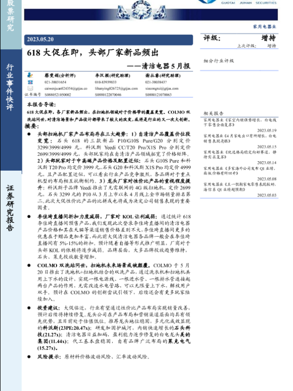 【国泰君安证券】【20230520】清洁电器行业5月报:618大促在即,头部厂家新品频出-16页