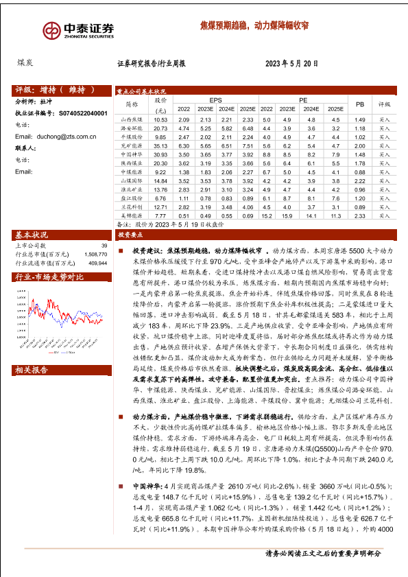 【中泰证券】【20230521】煤炭行业周报:焦煤预期趋稳,动力煤降幅收窄-27页