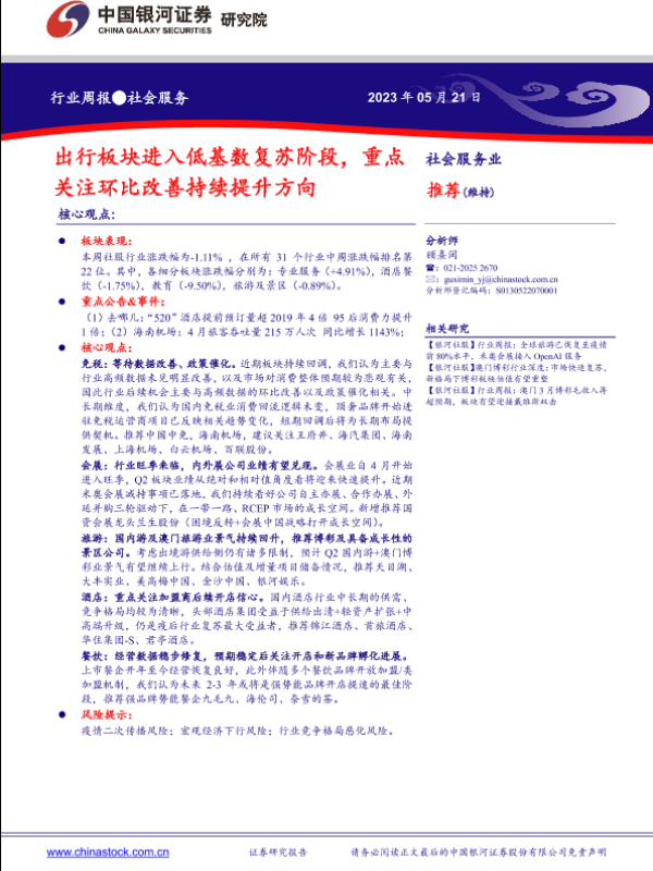 【银河证券】【20230521】社会服务行业周报:出行板块进入低基数复苏阶段,重点关注环比改善持续提升方向-15页