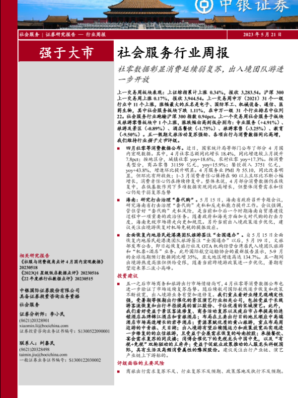 【中银证券】【20230521】社会服务行业周报:社零数据彰显消费延续弱复苏,出入境团队游进一步开放-18页