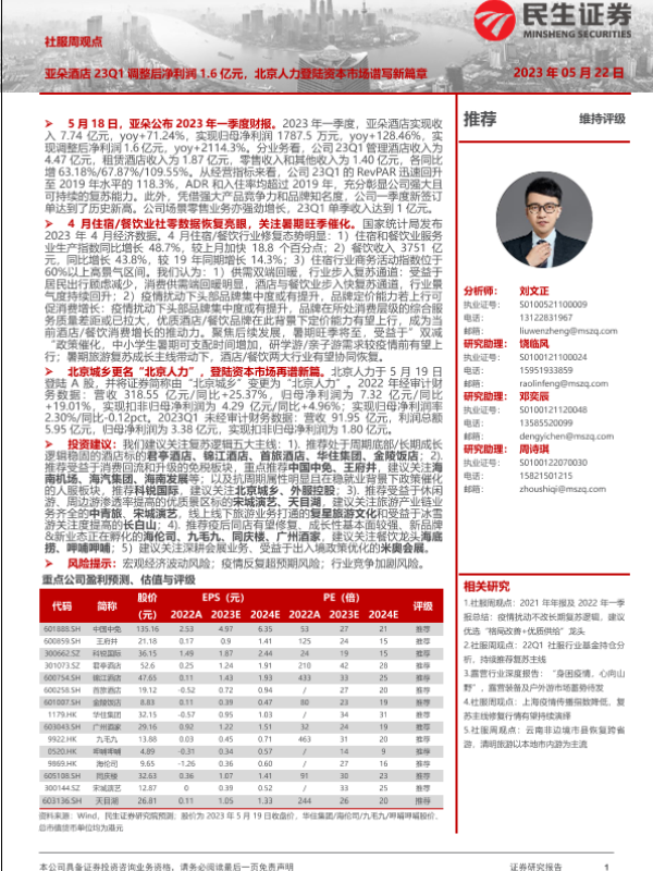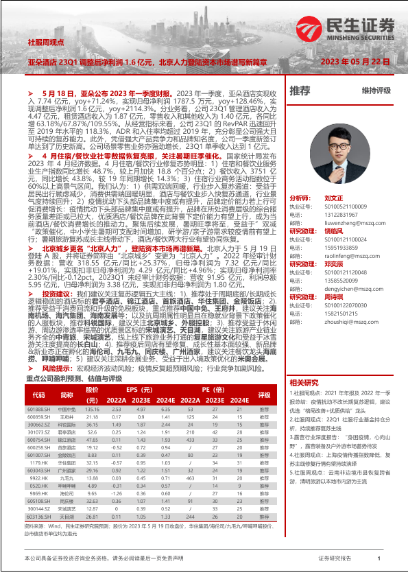 【民生证券】【20230522】社服周观点:亚朵酒店23Q1调整后净利润16亿元,北京人力登陆资本市场谱写新篇章-25页