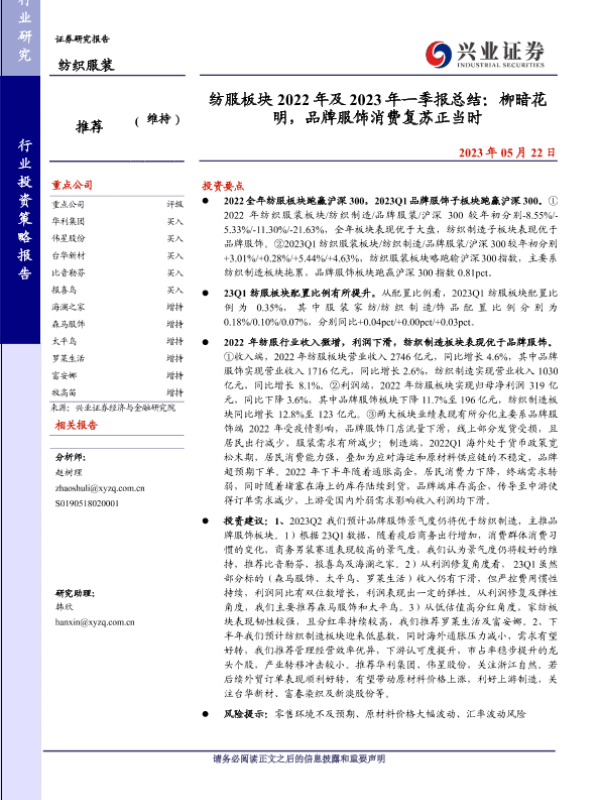 【兴业证券】【20230522】纺服板块2022年及2023年一季报总结:柳暗花明,品牌服饰消费复苏正当时-26页