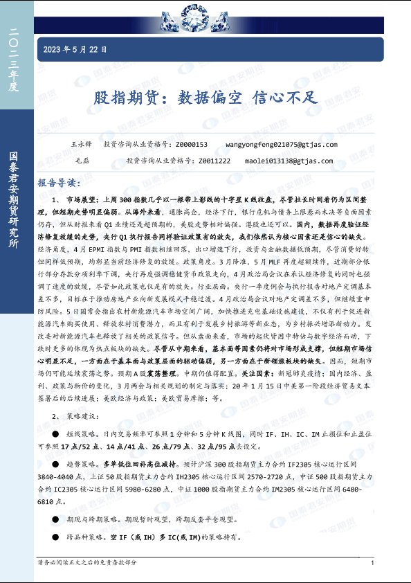 【国泰君安期货】【20230522】股指期货:数据偏空,信心不足-20页