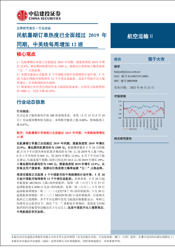 【中信建投证券】【20230521】航空运输行业:民航暑期订单热度已全面超过2019年同期,中美线每周增加12班-25页