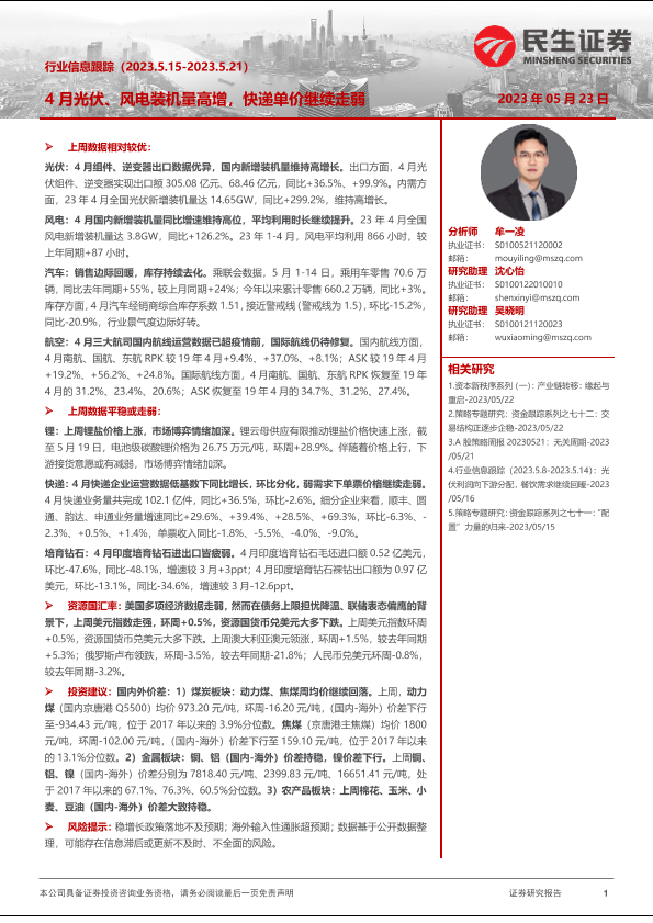 【民生证券】【20230523】行业信息跟踪:4月光伏、风电装机量高增,快递单价继续走弱-31页