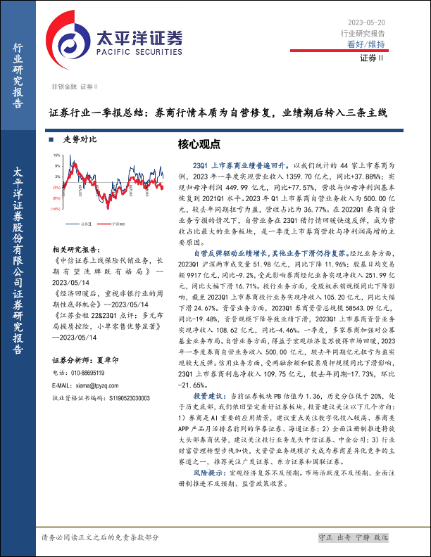 【太平洋证券】【20230520】证券行业一季报总结:券商行情本质为自营修复,业绩期后转入三条主线-17页