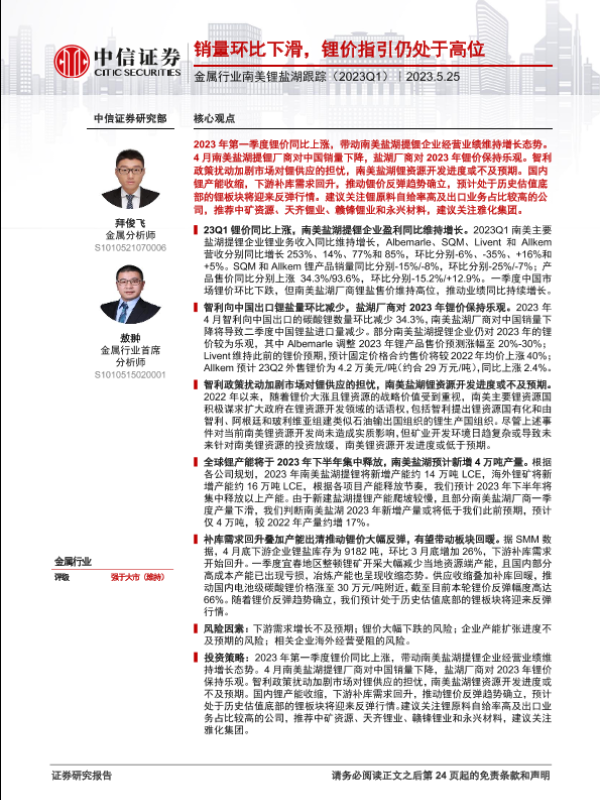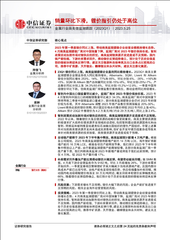 【中信证券】【20230525】金属行业南美锂盐湖跟踪(2023Q1):销量环比下滑,锂价指引仍处于高位-25页
