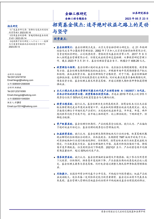【海通证券】【20230523】金融工程专题报告:招商基金侯杰,追寻绝对收益之路上的灵动与坚守-20页