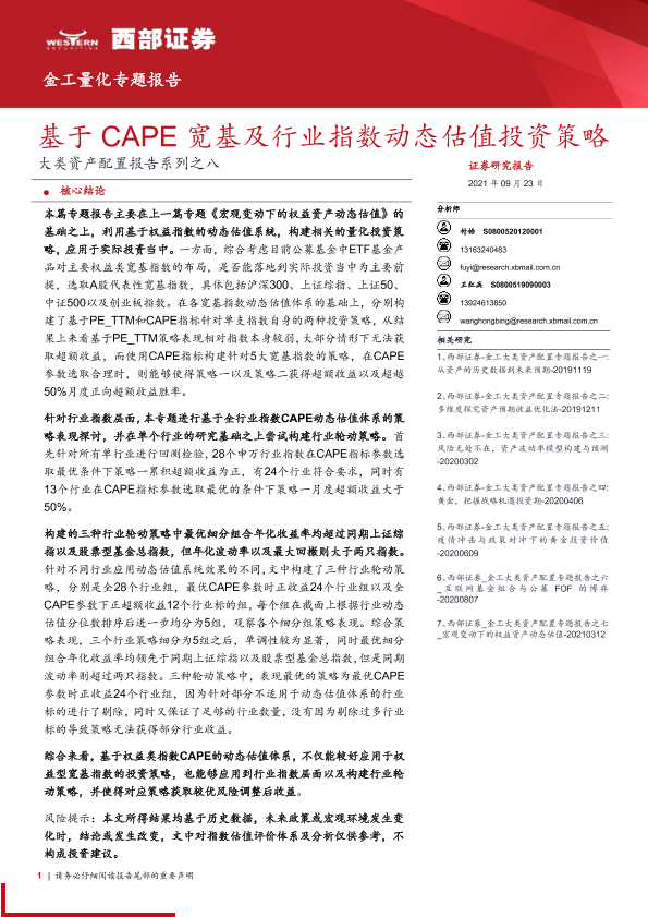 【西部证券】【20210923】大类资产配置报告系列之八:基于CAPE宽基及行业指数动态估值投资策略-22页