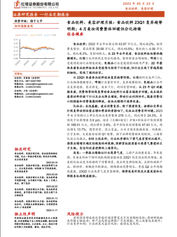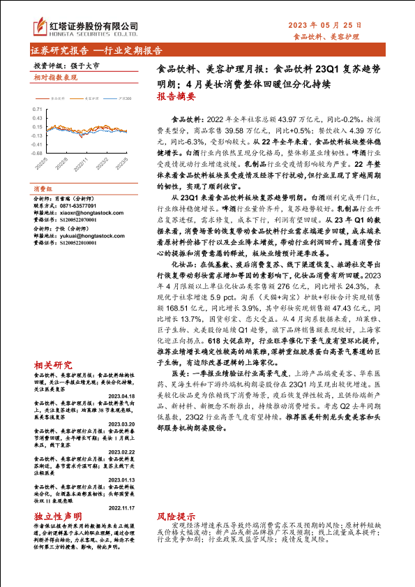 【红塔证券】【20230525】食品饮料、美容护理行业月报:食品饮料23Q1复苏趋势明朗;4月美妆消费整体回暖但分化持续-16页