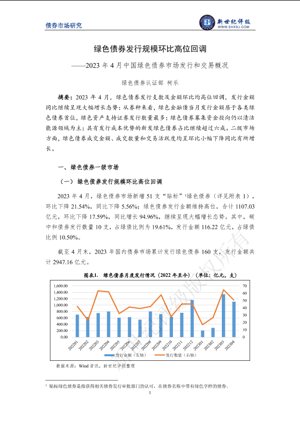 【新世纪评级】【20230401】绿色债券发行规模环比高位回调——2023年4月中国绿色债券市场发行和交易概况-10页