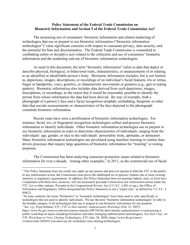 【Federal Trade Commission】【20230101】美国FTC发布关于生物识别信息的政策声明-12页