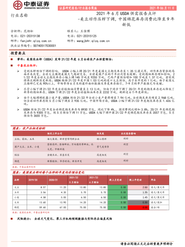 【中泰证券】【20210611】农业2021年6月USDA供需报告点评:美豆旧作压榨下调,中国棉花库存消费比降至9年新低-10页