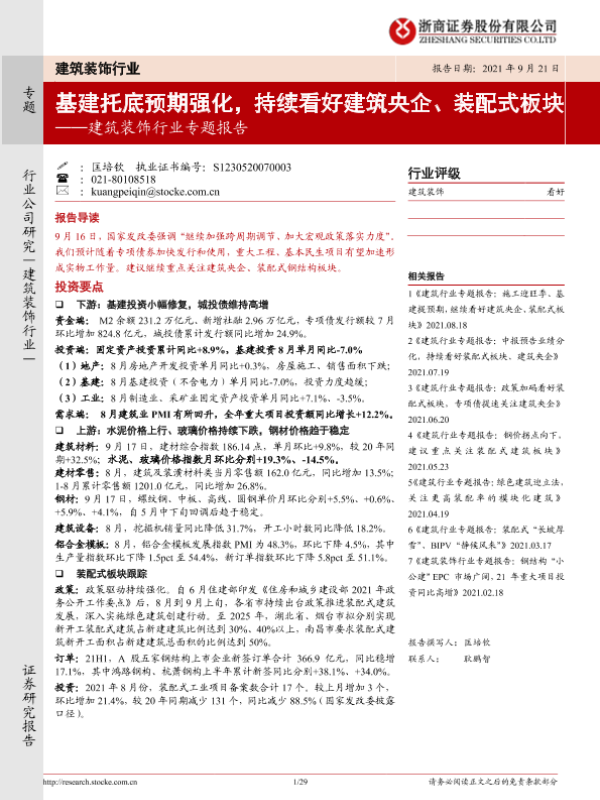 【浙商证券】【20210921】建筑装饰行业专题报告:基建托底预期强化,持续看好建筑央企、装配式板块-29页