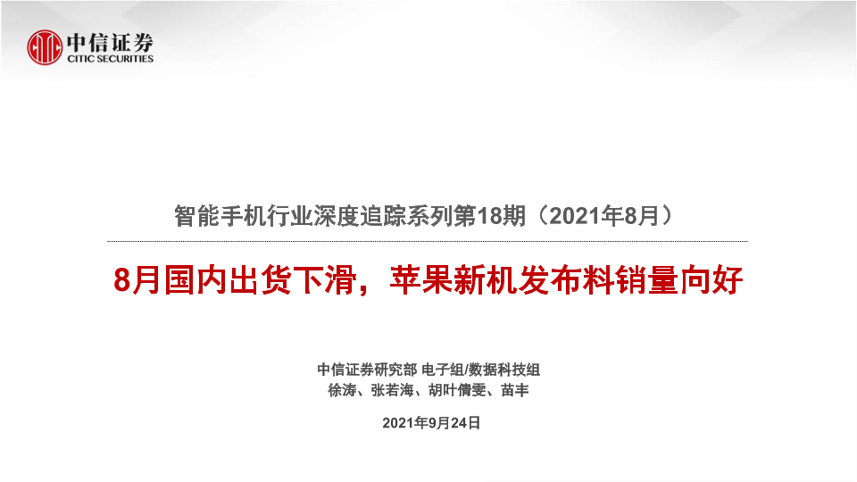 【中信证券】【20210924】智能手机行业深度追踪系列第18期(2021年8月):8月国内出货下滑,苹果新机发布料销量向好-40页