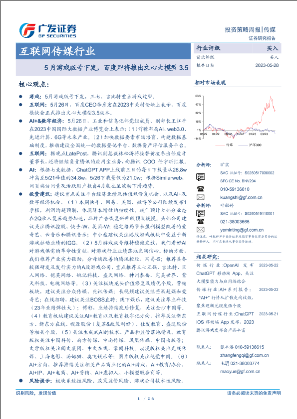【广发证券】【20230528】互联网传媒行业:5月游戏版号下发,百度即将推出文心大模型-26页