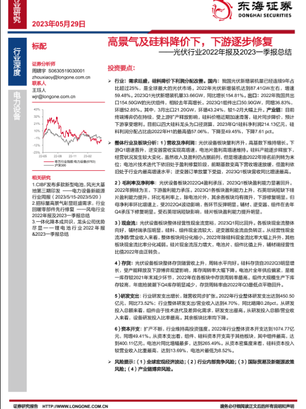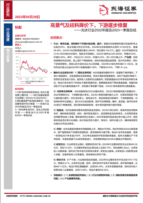 【东海证券】【20230529】光伏行业2022年报及2023一季报总结:高景气及硅料降价下,下游逐步修复-25页