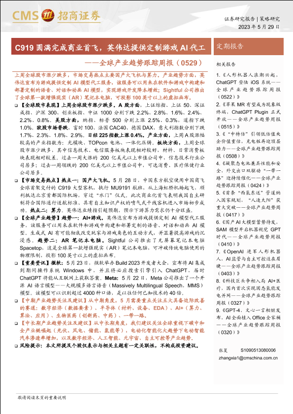 【海通证券】【20230529】全球产业趋势跟踪周报:C919圆满完成商业首飞,英伟达提供定制游戏AI代工-34页