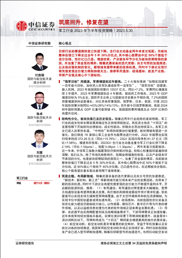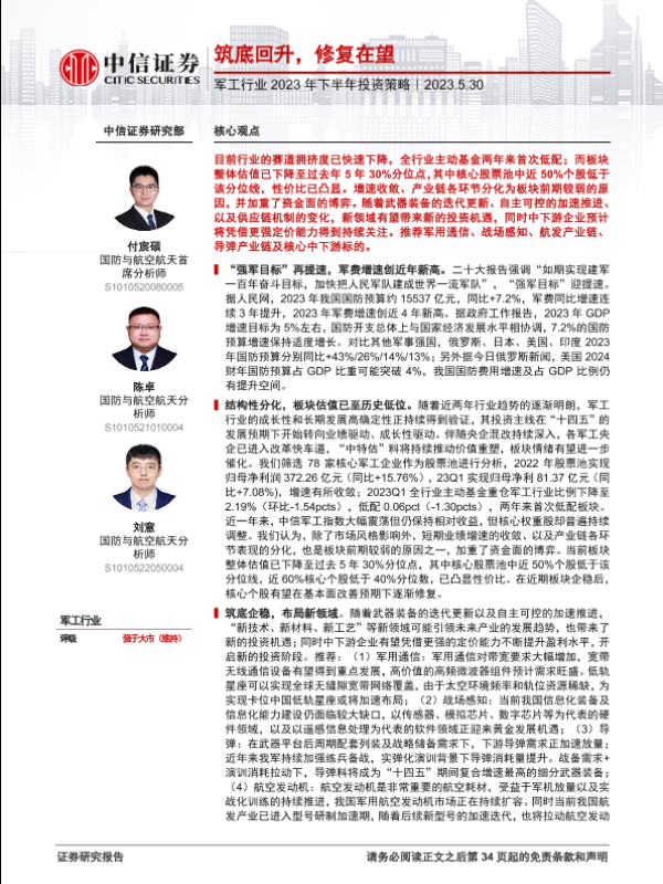 【中信证券】【20230530】军工行业2023年下半年投资策略:筑底回升,修复在望-35页
