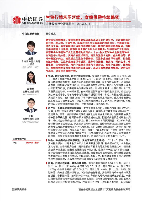 【中信证券】【20230531】农林牧渔行业跟踪报告:生猪行情承压延续,食糖供需持续偏紧-28页
