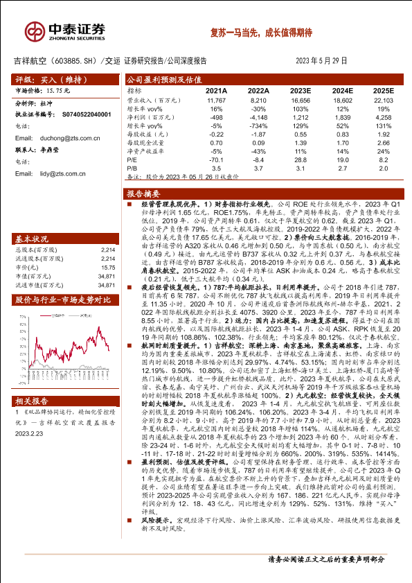 【中泰证券】【20230529】吉祥航空(603885)复苏一马当先,成长值得期待-25页