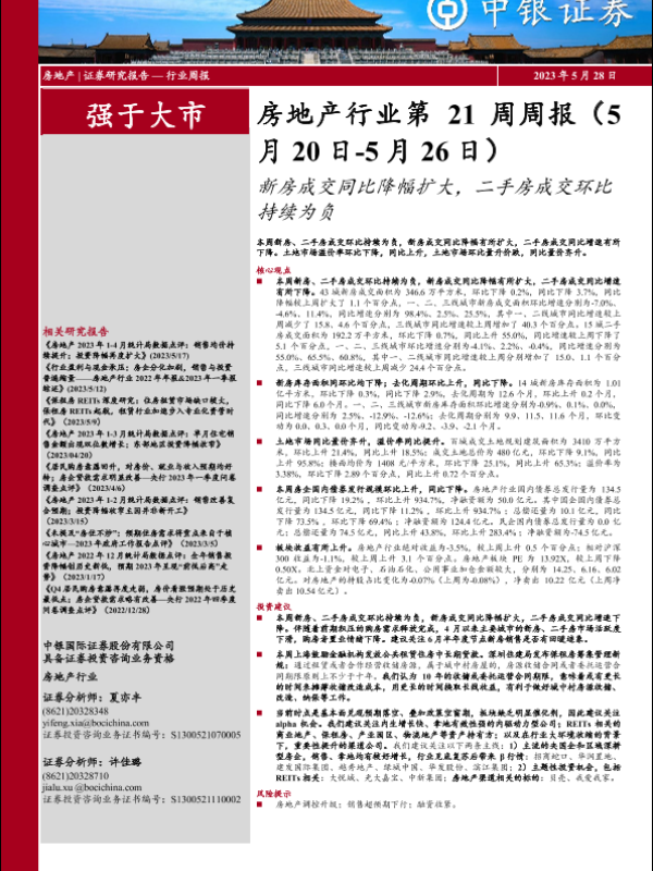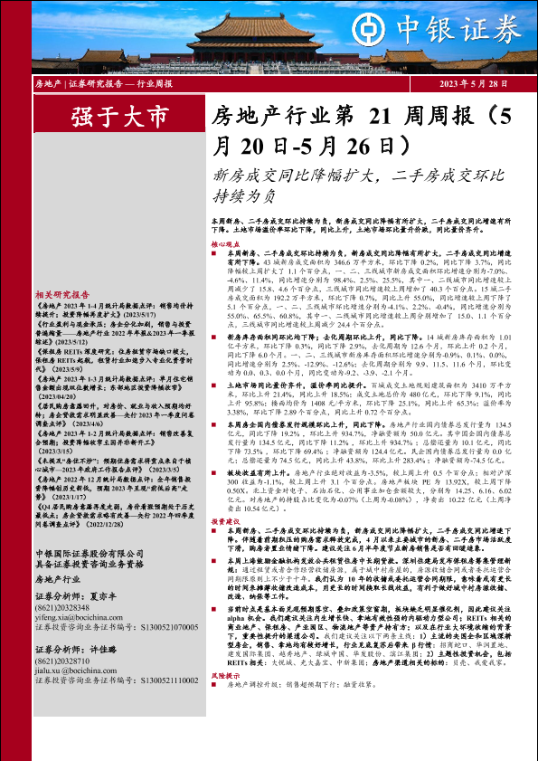 【中银证券】【20230528】房地产行业第21周周报:新房成交同比降幅扩大,二手房成交环比持续为负-28页