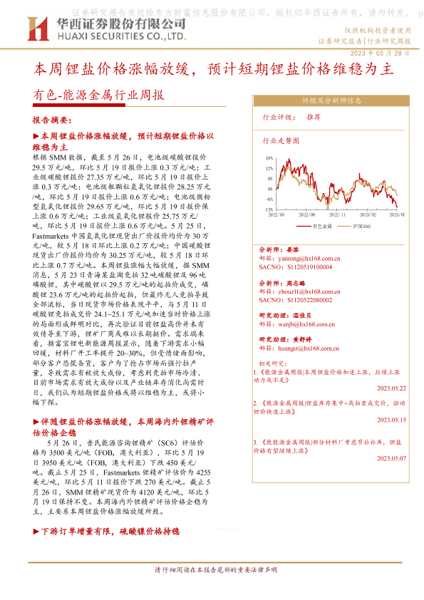 【华西证券】【20230528】有色-能源金属行业周报:本周锂盐价格涨幅放缓,预计短期锂盐价格维稳为主-27页