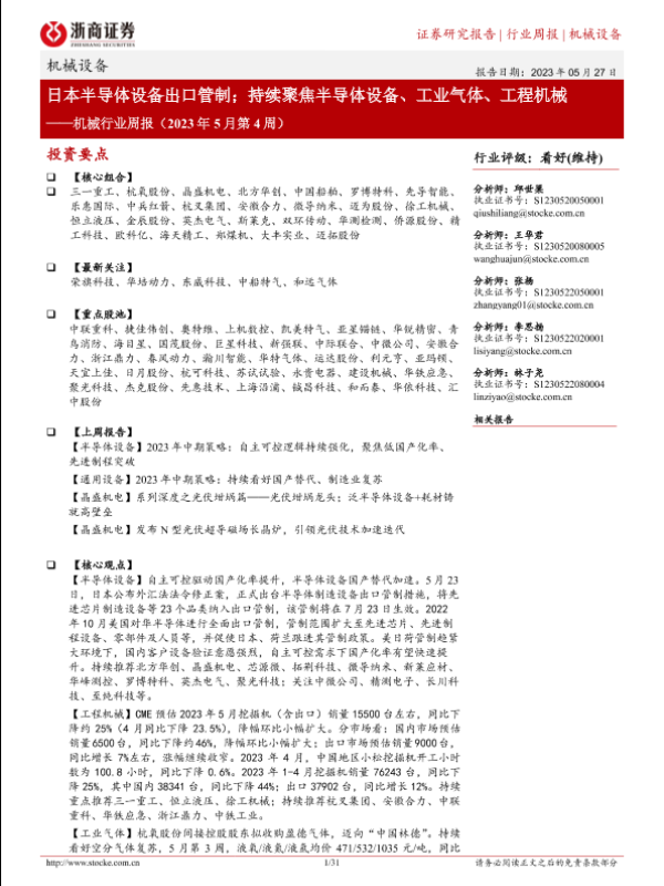 【浙商证券】【20230527】机械行业周报(2023年5月第4周):日本半导体设备出口管制;持续聚焦半导体设备、工业气体、工程机械-31页