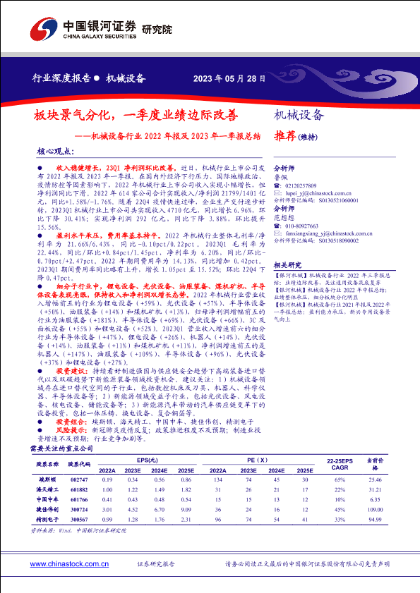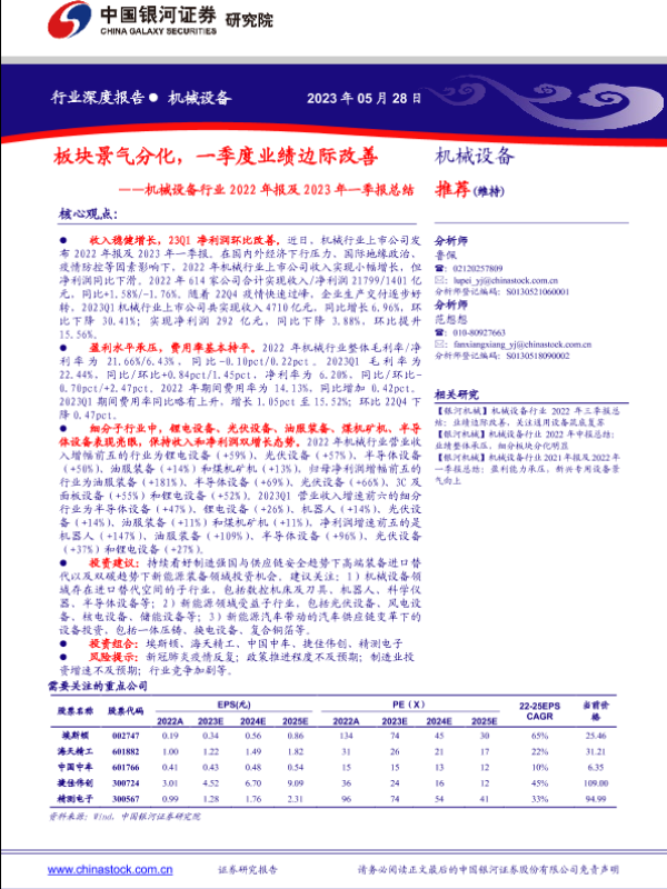 【银河证券】【20230528】机械设备行业2022年报及2023年一季报总结:板块景气分化,一季度业绩边际改善-86页