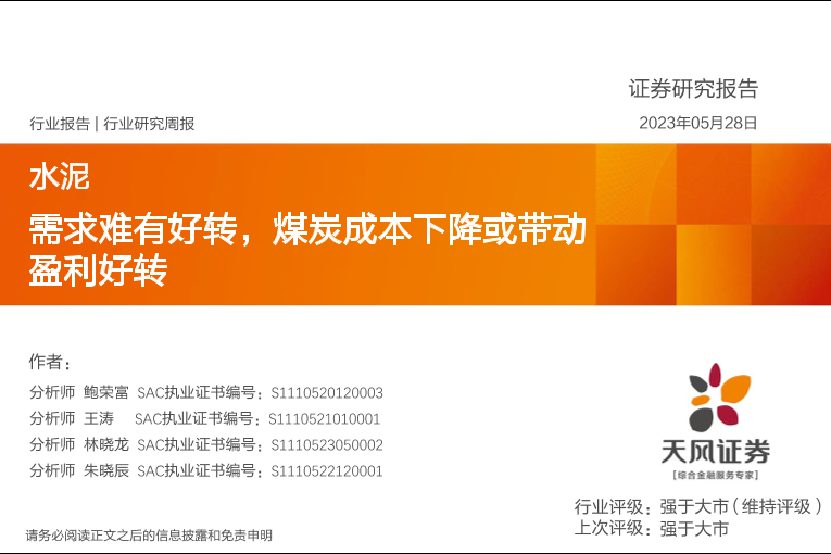 【天风证券】【20230528】水泥行业研究周报:需求难有好转,煤炭成本下降或带动盈利好转-22页