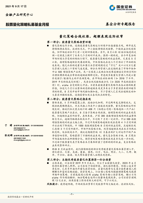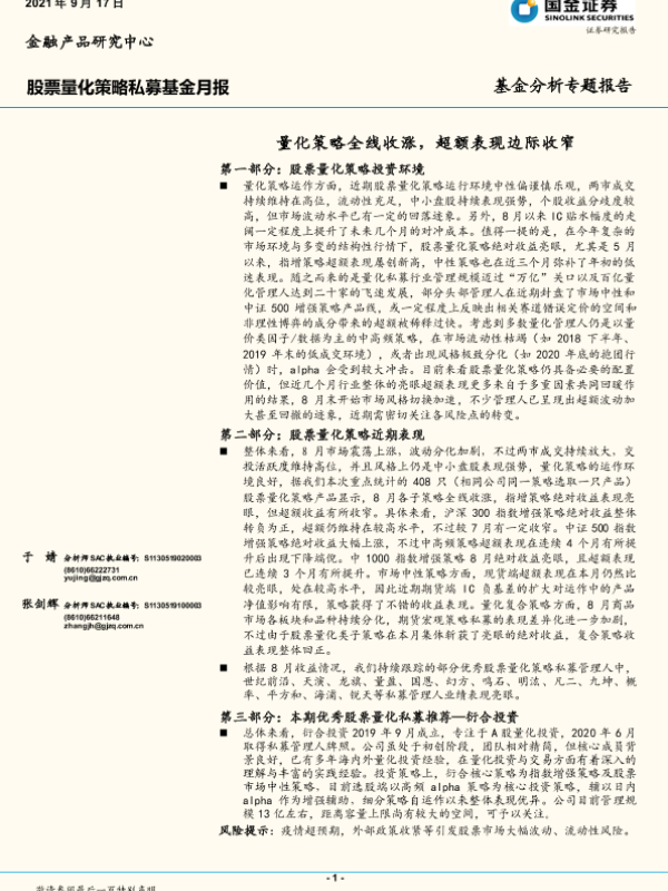 【国金证券】【20210917】股票量化策略私募基金月报:量化策略全线收涨,超额表现边际收窄-15页