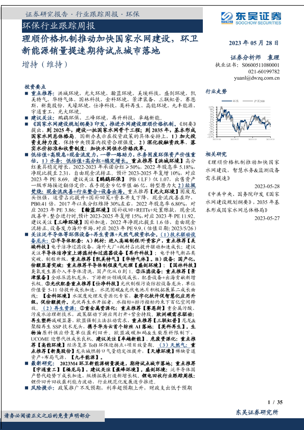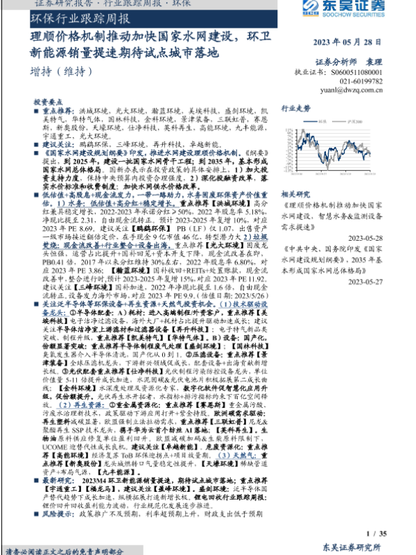 【东吴证券】【20230528】环保行业跟踪周报:理顺价格机制推动加快国家水网建设,环卫新能源销量提速期待试点城市落地-35页