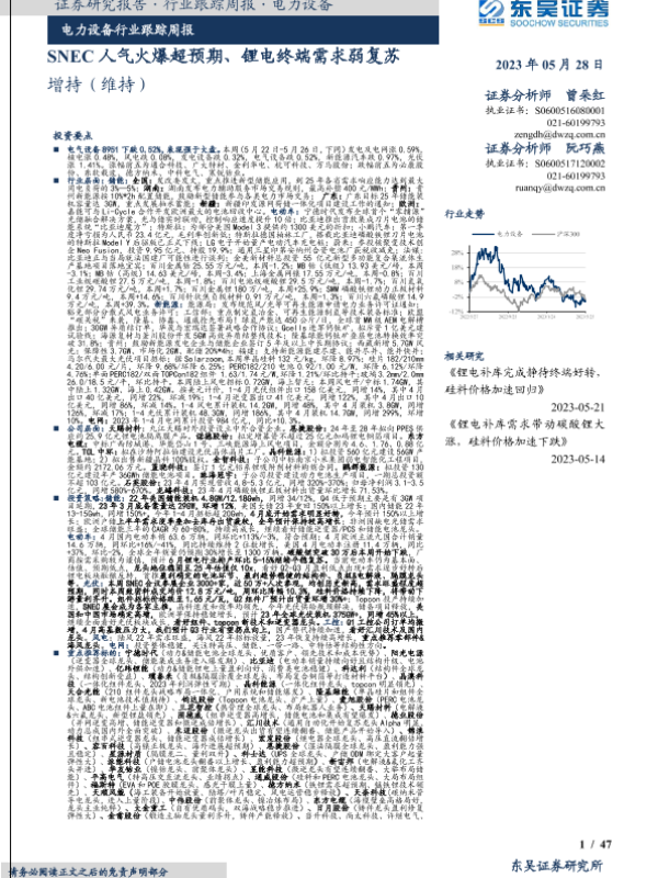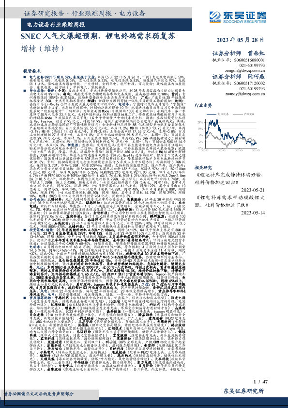【东吴证券】【20230528】电力设备行业跟踪周报:SNEC人气火爆超预期、锂电终端需求弱复苏-47页