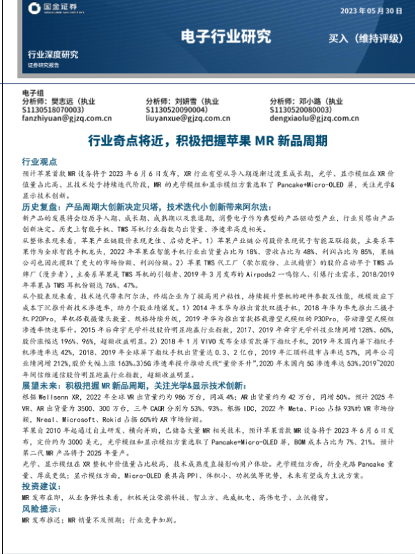【国金证券】【20230530】电子行业深度研究:行业奇点将近,积极把握苹果MR新品周期-17页