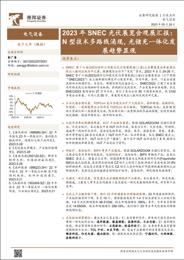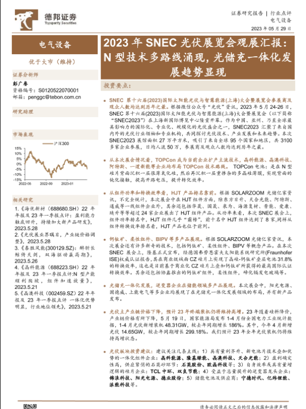 【德邦证券】【20230529】电气设备行业2023年SNEC光伏展览会观展汇报:N型技术多路线涌现,光储充一体化发展趋势显现-21页