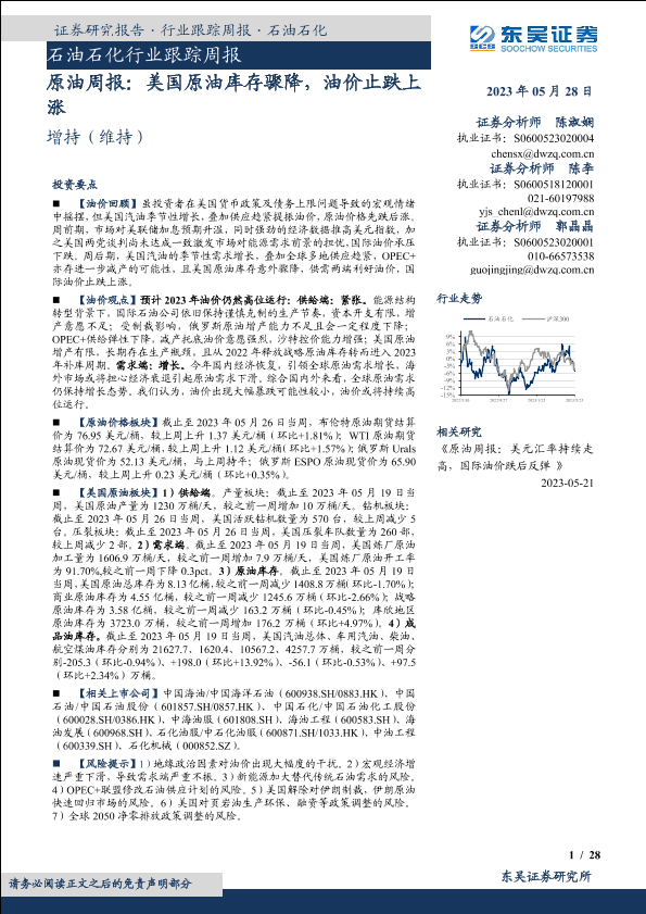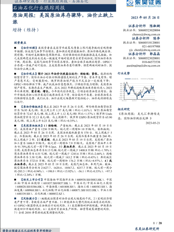 【东吴证券】【20230528】石油石化行业跟踪周报:原油周报:美国原油库存骤降,油价止跌上涨-28页