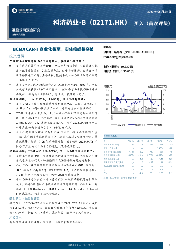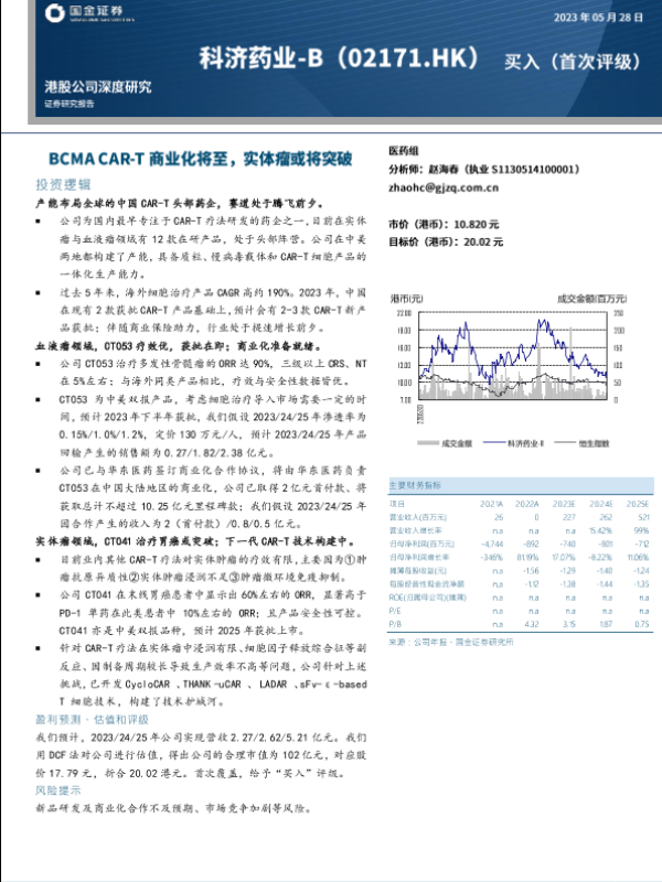 【国金证券】【20230528】科济药业-B(02171)BCMA CAR-T商业化将至,实体瘤或将突破-26页
