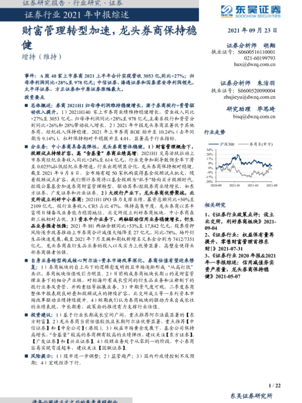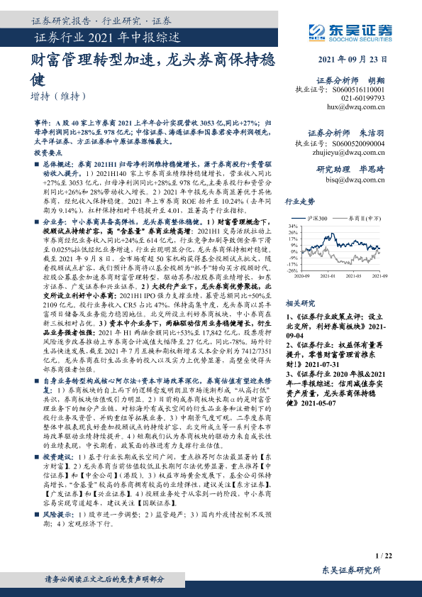 【东吴证券】【20210923】证券行业2021年中报综述:财富管理转型加速,龙头券商保持稳健-22页