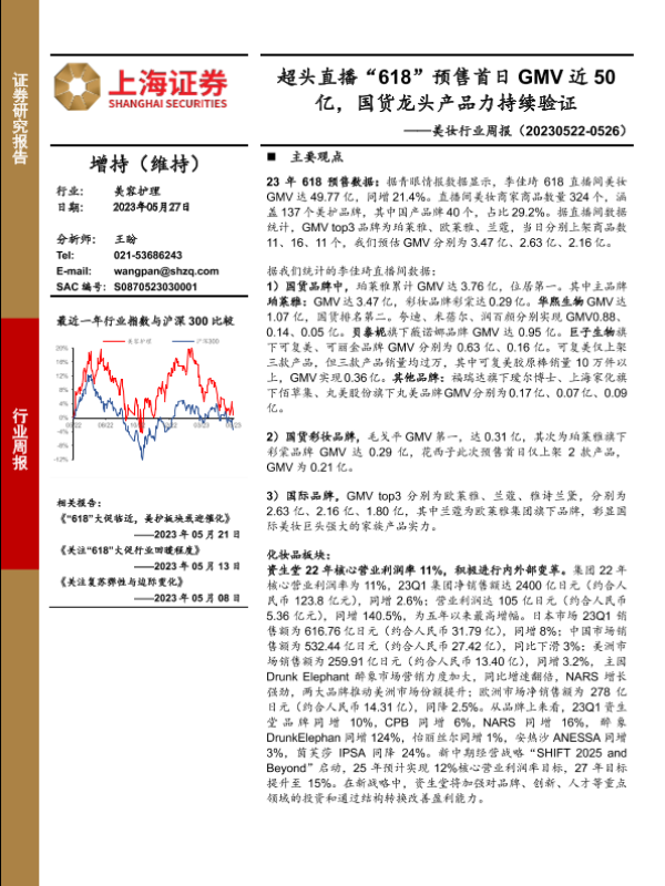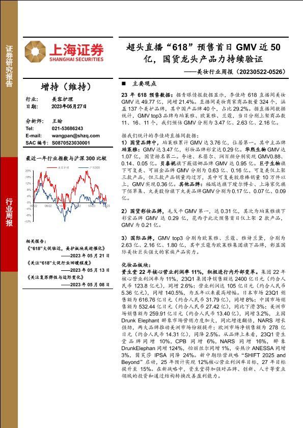 【上海证券】【20230527】美妆行业周报:超头直播“618”预售首日GMV近50亿,国货龙头产品力持续验证-25页