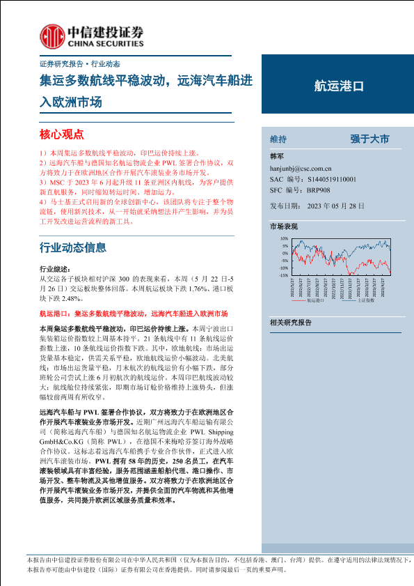 【中信建投证券】【20230528】航运港口行业:集运多数航线平稳波动,远海汽车船进入欧洲市场-26页