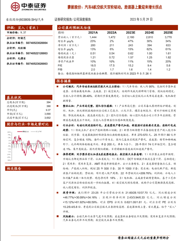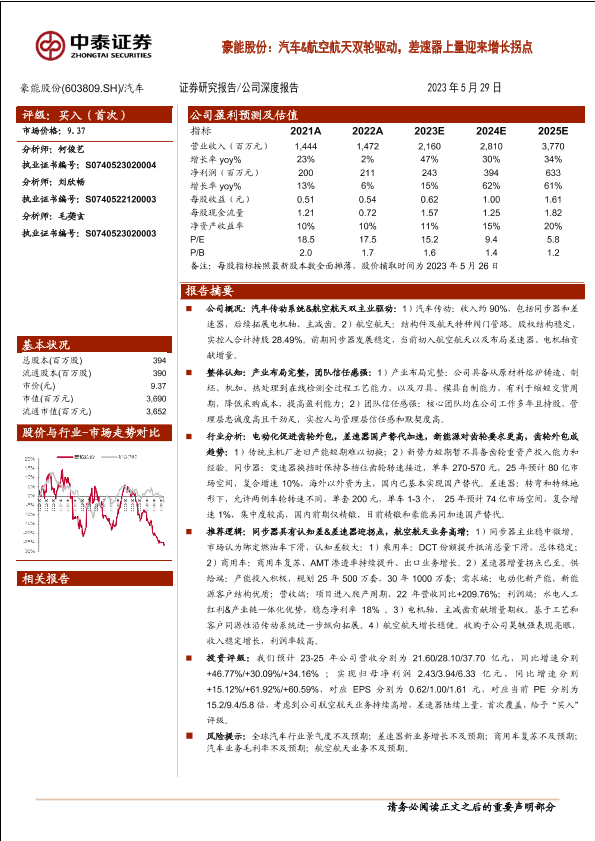 【中泰证券】【20230529】豪能股份(603809):汽车&航空航天双轮驱动,差速器上量迎来增长拐点-22页