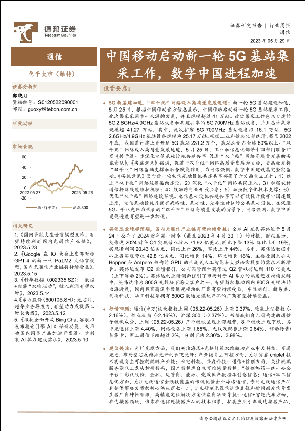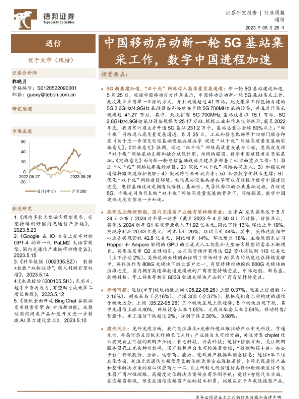 【德邦证券】【20230529】通信行业周报:中国移动启动新一轮5G基站集采工作,数字中国进程加速-16页