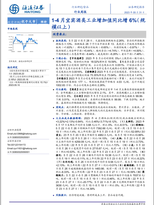 【海通证券】【20230531】食品行业周报:1-4月宜宾酒类工业增加值同比增6%(规模以上)-20页