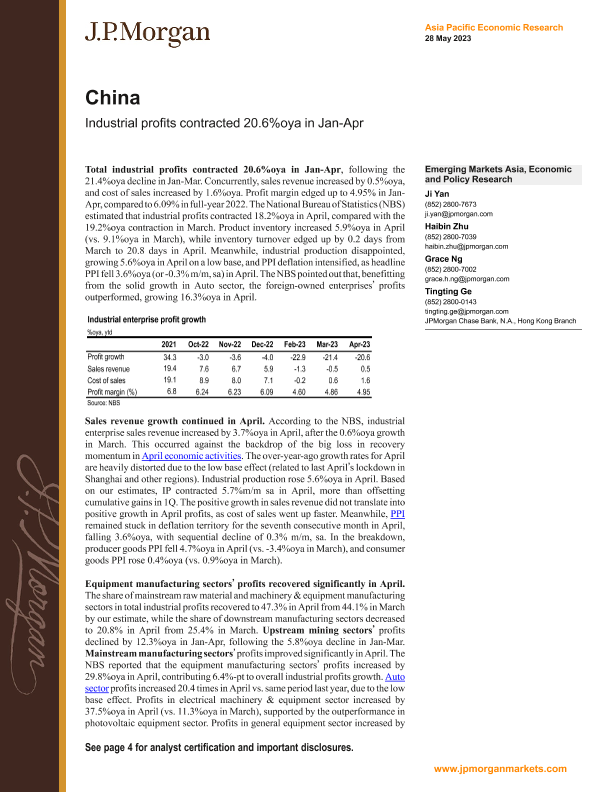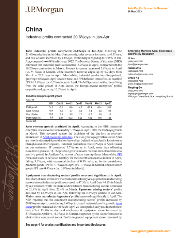 【J.P. Morgan】【20230528】JPMorgan Econ - China Industrial profits contracted 20.6%oya in Jan-Apr-8页