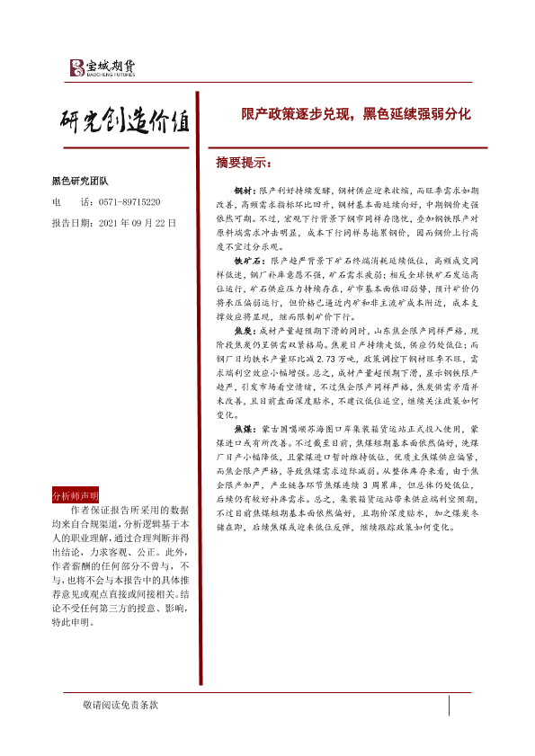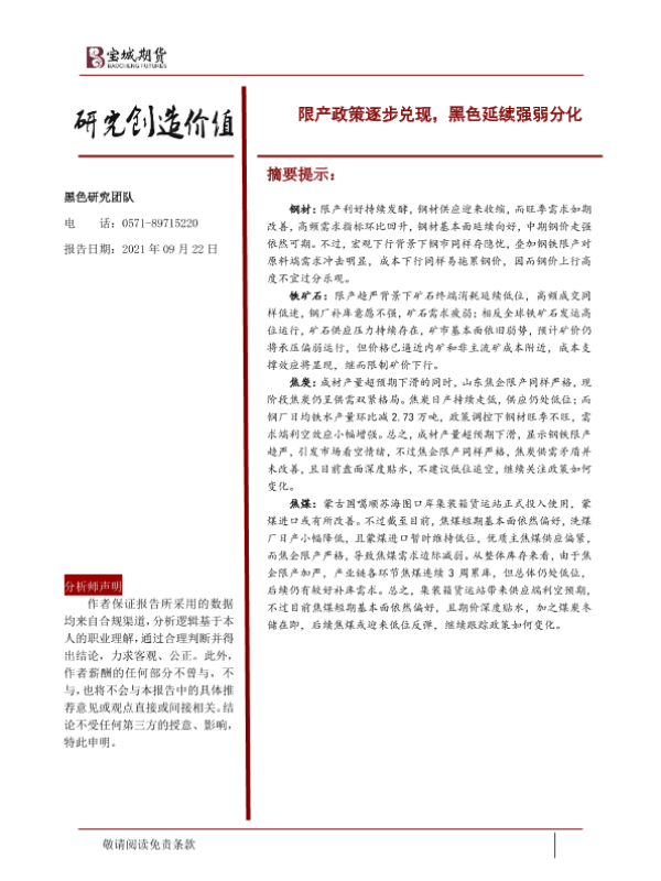 【宝城期货】【20210922】限产政策逐步兑现,黑色延续强弱分化-30页